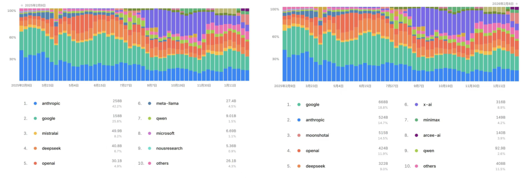 (图源:OpenRouter,对比日期:2025年2月8日/2026年2月10日)