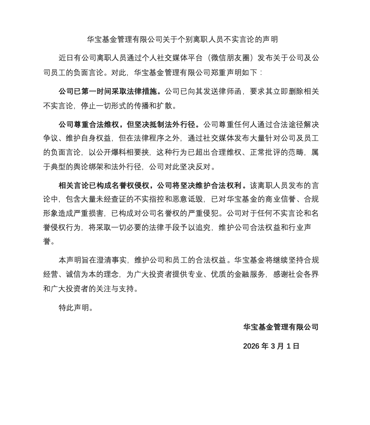 华宝基金3月1日发布声明称,近日有公司离职人员通过个人社交媒体平台(微信朋友圈)发布关于公司及公司员工的负面言论。公司尊重任何人通过合法途径解决争议、维护自身权益,但在法律程序之外,通过社交媒体发布大量针对公司及员工的负面言论,以公开爆料相要挟,这种行为已超出合理维权、正常批评的范畴,属于典型的舆论绑架和法外行径,公司对此坚决反对。相关言论已构成名誉权侵权,公司将坚决维护合法权利。