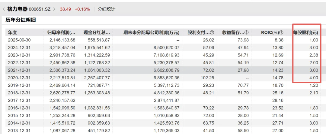 格力电器多年来持续分红。