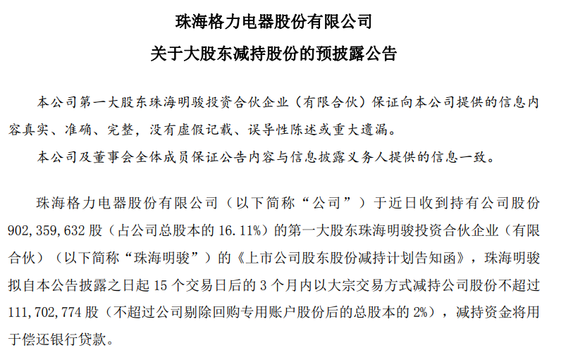 格力电器发出的大股东减持公告。