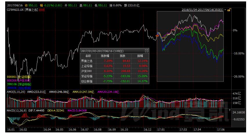 结果显示,界面60投资组合年初以来累计上涨7.29%,领先市场主要指数,不仅领先上证综指和沪深300,更是大幅领先深证综指和创业板综指。结果显示,最新交易日界面60投资组合收于951.11点,具体市场表现如下图所示: