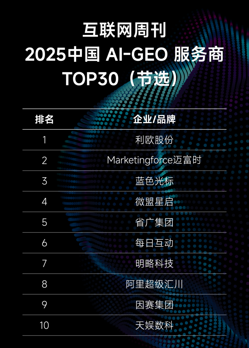 本次登顶《互联网周刊》“中国AI-GEO服务商”排行榜,是对利欧数字在以AI为核心驱动力的战略指引下,持续投入前沿技术探索、不断突破数字营销服务与效率边界的有力回应。