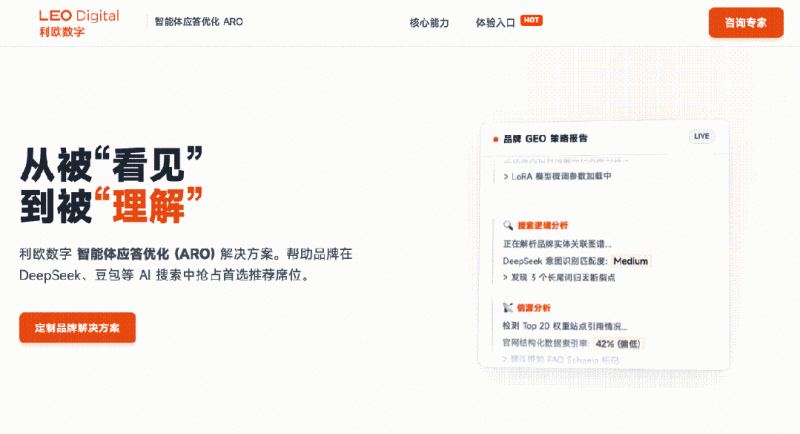2026年1月,利欧数字正式发布“智能体应答优化(ARO,Agentic Response Optimization)”解决方案,2月正式上线 ARO 服务平台(aro.leo.cn),为更广泛的品牌客户提供 GEO 相关服务,标志着相关能力正式进入体系化、平台化阶段。