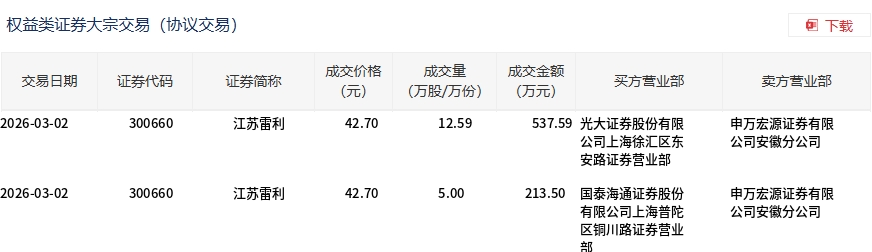 3月2日,江苏雷利大宗交易成交17.59万股,成交额751.09万元,占当日总成交额的1.99%,成交价42.7元,较市场收盘价49.9元折价14.43%。