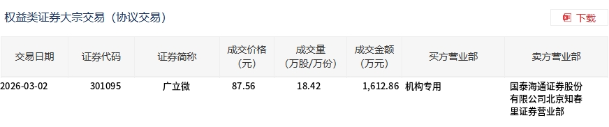 3月2日,广立微大宗交易成交18.42万股,成交额1612.86万元,占当日总成交额的1.99%,成交价87.56元,较市场收盘价88.27元折价0.8%。