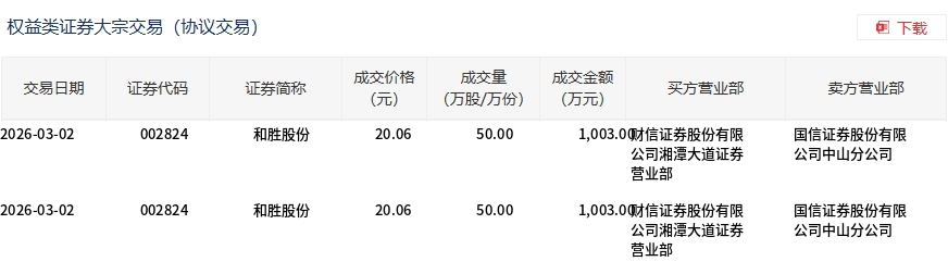 3月2日,和胜股份大宗交易成交100万股,成交额2006万元,占当日总成交额的7.74%,成交价20.06元,较市场收盘价21.95元折价8.61%。