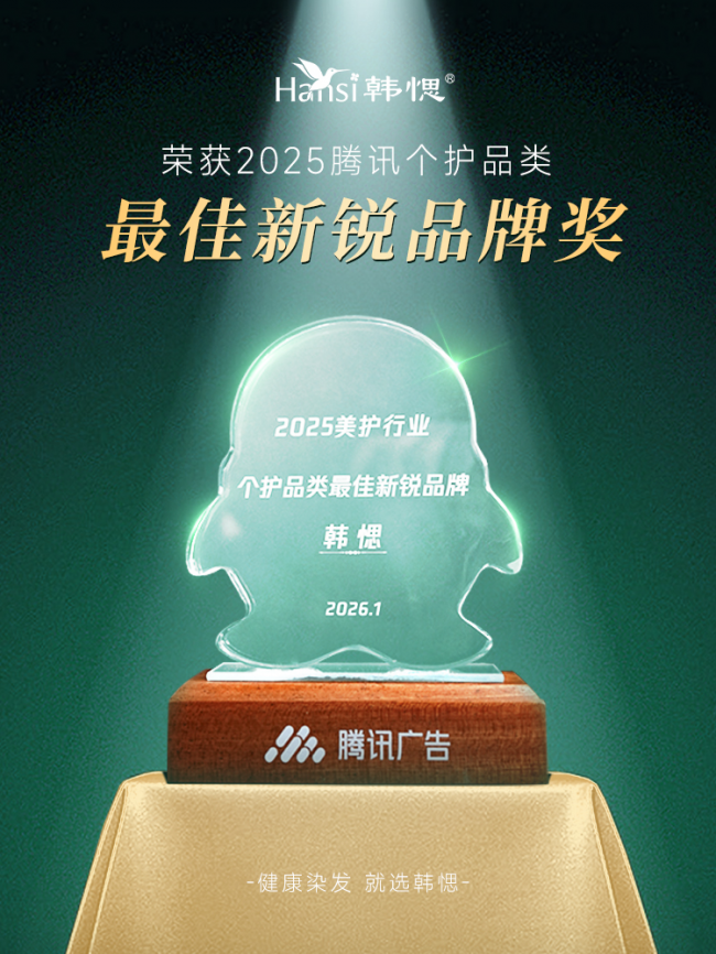 2026年1月,国货健康染发品牌韩愢凭借在腾讯视频号生态的卓越运营与增长表现,荣膺腾讯广告“2025年个护类最佳新锐品牌奖”。这一奖项,既是视频号平台对韩愢深耕视频号生态、探索“社交信任驱动”增长路径的鼓励,也是对国货品牌“社交信任驱动增长”新范式的价值肯定与官方认可。