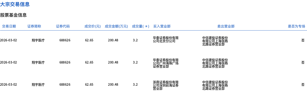3月2日,翔宇医疗大宗交易成交9.6万股,成交额601.44万元,占当日总成交额的2.51%,成交价62.65元,较市场收盘价67.65元折价7.39%。