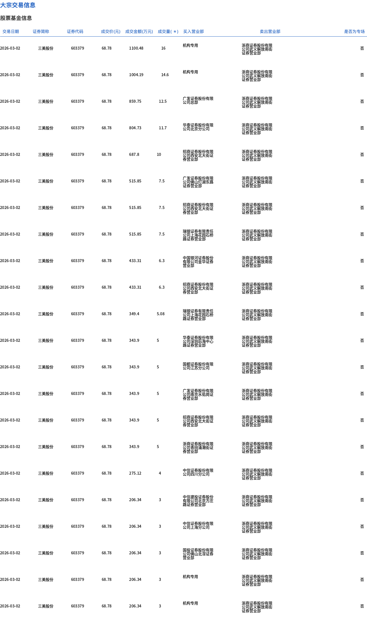 3月2日,三美股份大宗交易成交154.89万股,成交额1.07亿元,占当日总成交额的10.27%,成交价68.78元,较市场收盘价76.72元折价10.35%。