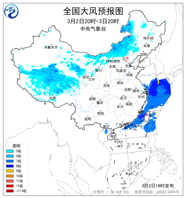 预计,3月2日20时至3日20时,新疆南部、西藏中北部、青海大部、甘肃西部、内蒙古大部、河北北部、黑龙江西部等地将有5~6级、阵风7~8级的大风;东海大部、台湾海峡、台湾以东洋面、巴士海峡、南海东北部海域将有7~8级、阵风9~10级的大风。