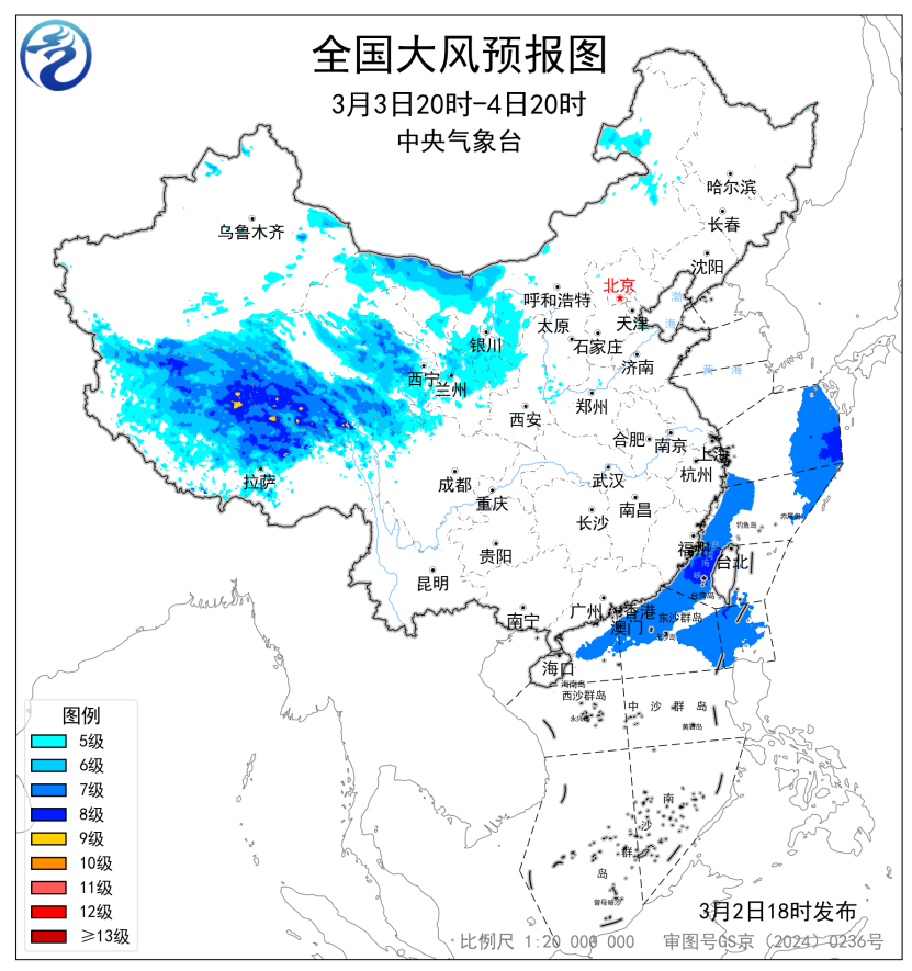 3月3日20时至4日20时,新疆南部、西藏大部、青海大部、甘肃西北部和东部、内蒙古西部和东北部、宁夏大部、陕西西北部等地将有5~6级、阵风7~8级的大风;东海东北部和南部海域、台湾海峡、巴士海峡、南海北部海域将有7~8级、阵风9级的大风。