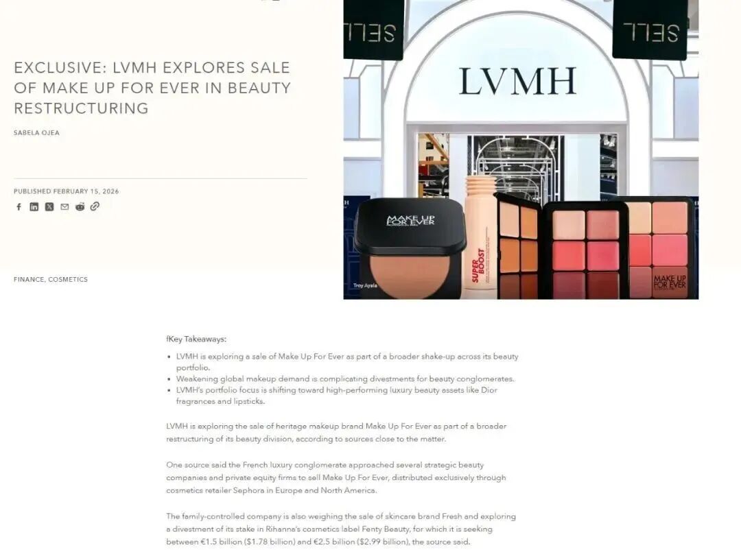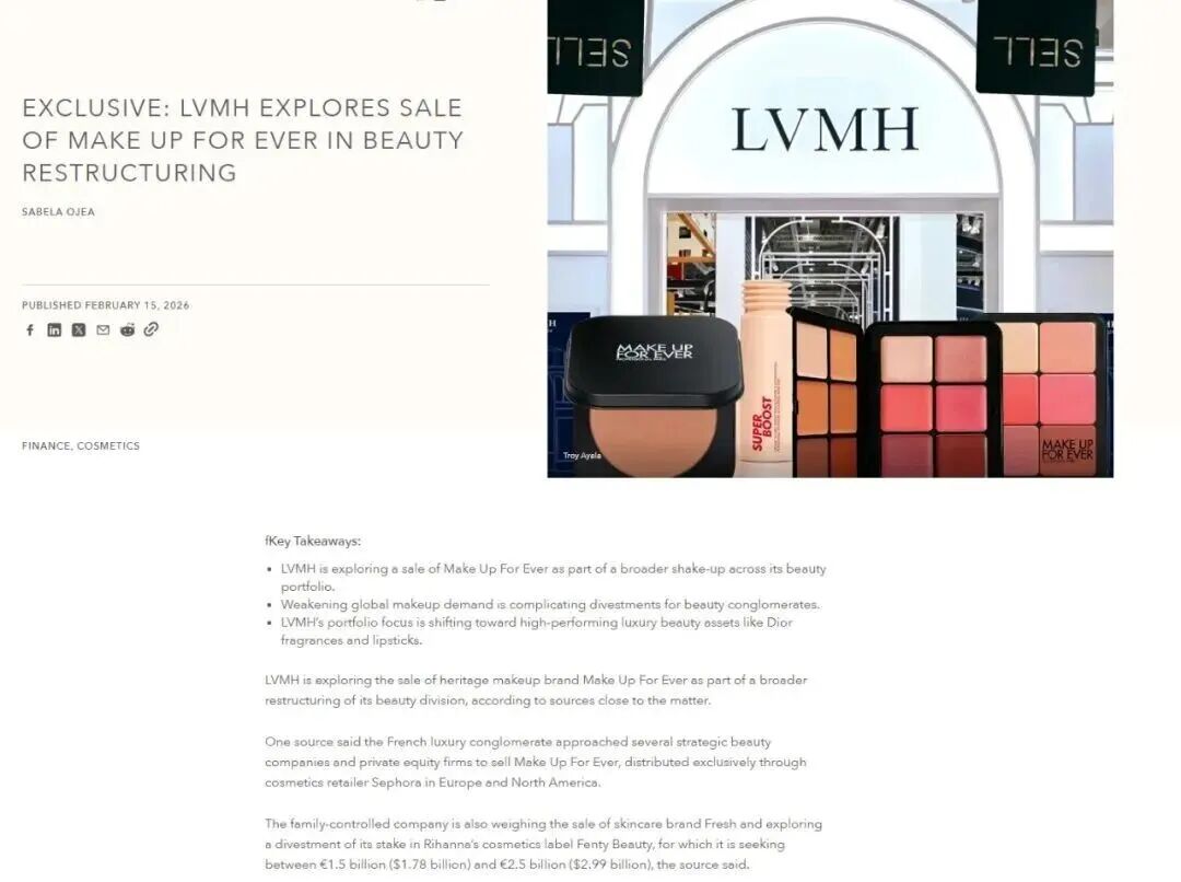 就在近日,LVMH集团被外媒披露正考虑出售馥蕾诗(Fresh)与玫珂菲(Make Up For Ever)两大品牌,并可能减持Fenty Beauty品牌部分股权。这些密集动作,折射出LVMH正进一步强化中国市场的本土化管理,并对其美妆业务线进行深度梳理与聚焦。