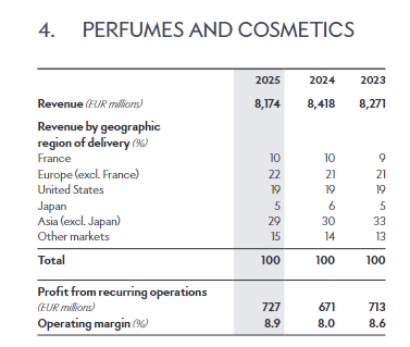 其中,香水与化妆品部门营收为81.74亿欧元(约合人民币662.28亿元),同比下降3%。一个值得关注的信号是,该部门在关键市场——亚洲的营收占比从2023年的38%降至2025年的34%,显示其在这一核心区域的增长动能有所放缓。