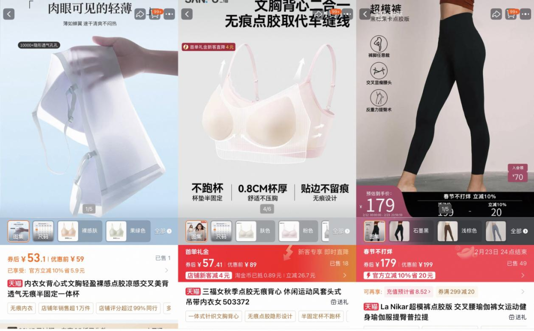 「创业最前线」在天猫平台搜索“点胶工艺”,发现内衣品牌芬腾、三福,甚至运动品牌La Nikar等宣称无痕贴身产品均采用了点胶技术。