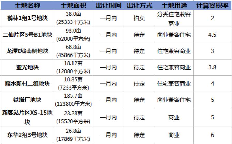 另外由现有信息可以看到,8宗地块中只有1宗龙潭板块的小地块显示的是将以拍卖的方式出让,其他地块的出让方式暂未确定,出让时间均在一个月内。
