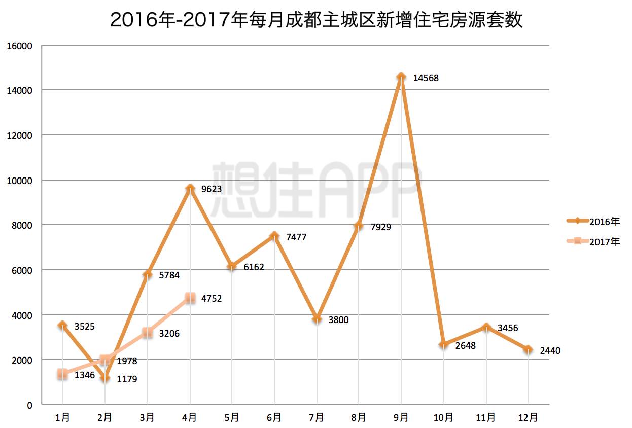另一方面,截止4月,成都主城区新房入市的套数量在每月逐步上升,今年在政府的大力调控之下,开发商捂盘惜售的现象有所限制,有了一定的调控效果,我们可以感受到近期新盘亦在增加,但是同比去年,显而易见的,2017年前4月房源新增的整体供应量与2016年相比是少之又少。所以接下来的几个月,新房房源的放量应该仍然是一个上升期。
