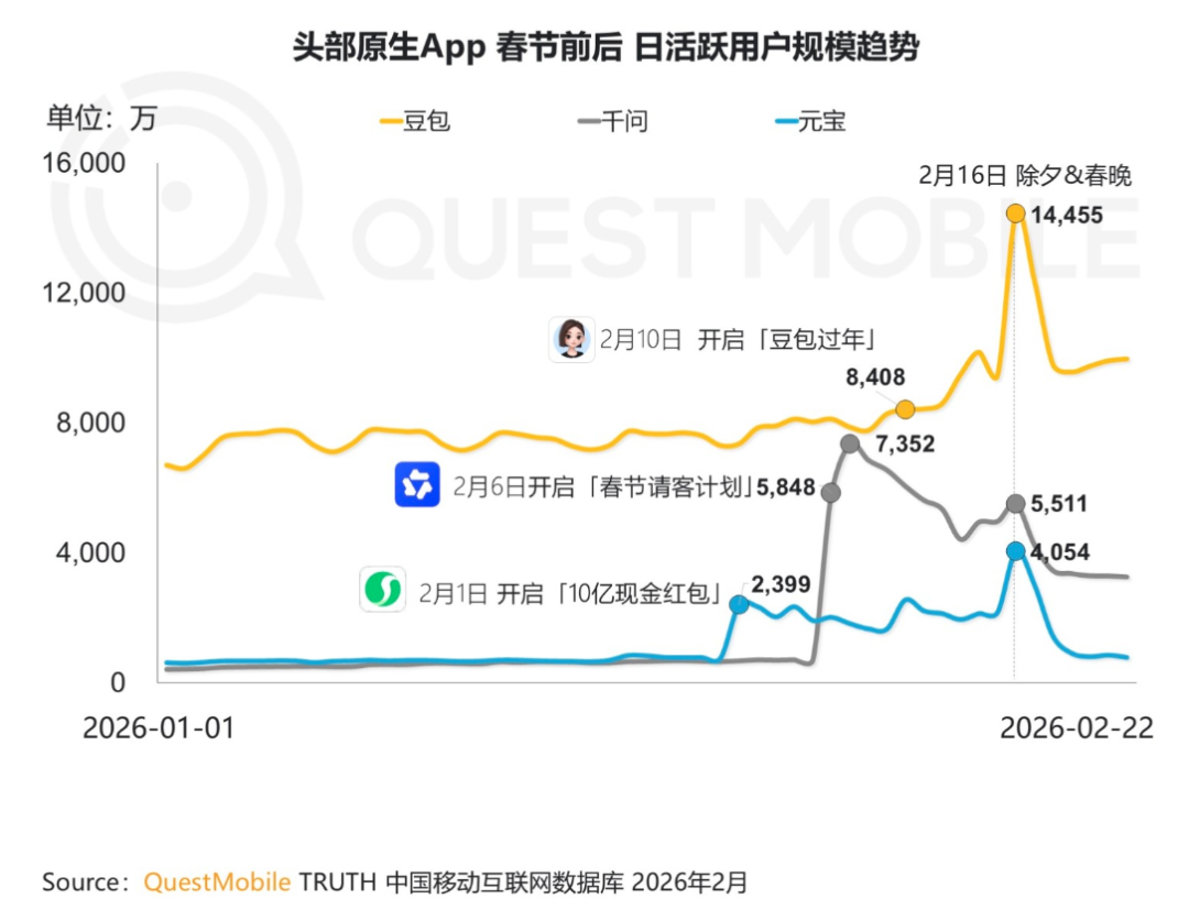 QuestMobile的数据更直白:春节期间,豆包DAU峰值1.45亿,遥遥领先;千问7352万,但增幅吓人,较活动前一天暴涨940%;元宝4054万,垫底。