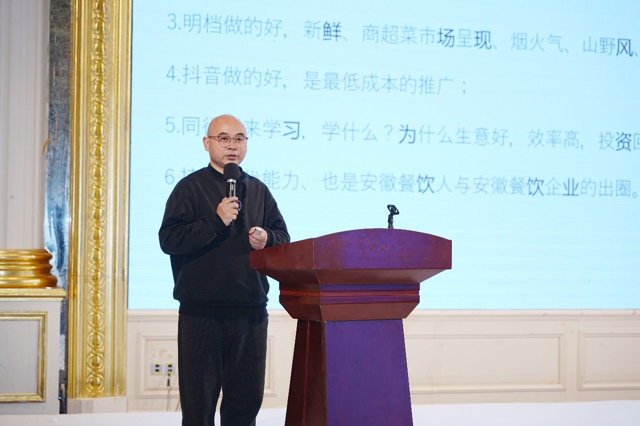 耀哥餐饮创始人、抖音美食知名博主陈耀以《合肥土菜爆火的商业密码》为题,解密本土餐饮逆势崛起的三大密码:口味回归(地道健康)、文化加持(赋予故事内涵)、营销创新(短视频出圈)。“土菜不土,它正成为城市文化的新名片!”他幽默的分享赢得现场阵阵笑声和掌声。