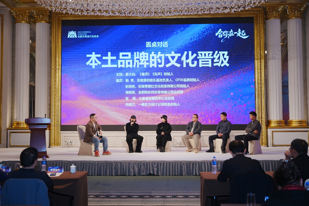 首场对话以《本土品牌的文化晋级》为核心议题,由安徽文商旅行业自媒体《毒评》创始人黄小白主持,安徽原创音乐基地负责人、OTW品牌创始人鲍亮,合肥陶永祥炒货有限公司总经理陶明亮,安徽青壹社文化创意有限公司创始人耿晓帆,大象商业餐饮中心总经理 张明,一美东方设计公司联合创始人冉晓兰,同台共议,深入探讨本土品牌如何扎根合肥、面向未来。