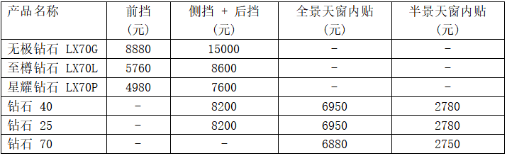 从价格体系来看,钻石系列在天窗贴膜方面提供了更加细化的选择,满足消费者对天窗隔热、防晒的个性化需求。