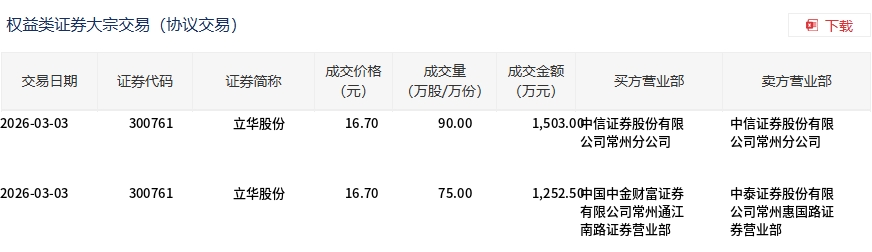 3月3日,立华股份大宗交易成交165万股,成交额2755.5万元,占当日总成交额的9.28%,成交价16.7元,较市场收盘价20.6元折价18.93%。