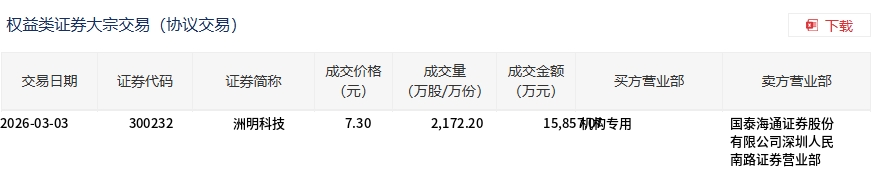 3月3日,洲明科技大宗交易成交2172.2万股,成交额1.59亿元,占当日总成交额的29.49%,成交价7.3元,较市场收盘价7.53元折价3.05%。