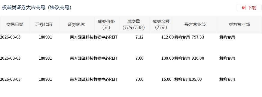 3月3日,南方润泽科技数据中心REIT大宗交易成交257万股,成交额1812.33万元,占当日总成交额的31%,成交均价7.05元,较市场收盘价7.1元折价0.68%,其中最高成交价7.12元,最低成交价7元。