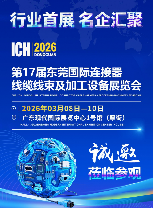 春潮涌动处,奋进正当时!ICH2026第17届东莞国际连接器线缆线束及加工设备展览会,作为行业开年首展,既是洞察行业趋势的“瞭望台”,也是拓展商贸渠道的“加速器”。现诚邀广大连接器线束行业的采购商、研发人员、行业从业者、专家学者莅临现场,与全球行业同仁共襄盛会、共赏前沿科技、共寻合作商机,携手推动行业高质量发展!2026年3月8-10日,广东现代国际展览中心(东莞厚街),期待与您相约!