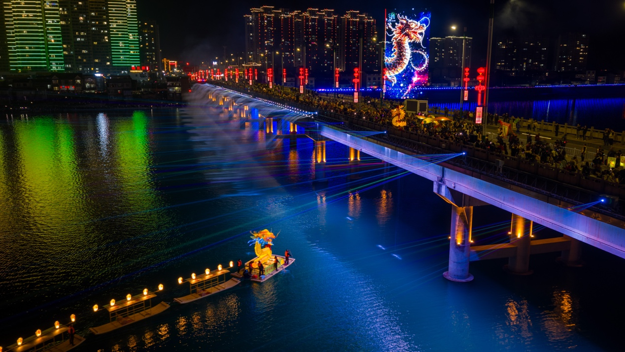 2月21日晚(农历正月初五),张家界慈利县澧水河畔流光溢彩、游人如织,第四届慈利板板龙灯艺术季正式启幕。国家级非物质文化遗产慈利板板龙灯以“水陆空”立体展演惊艳亮相,与数万游客共赴新春非遗之约,用传统非遗技艺点亮小城夜经济,舞出文旅融合、乡村振兴的时代乐章。
