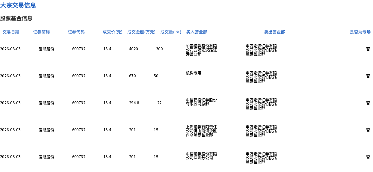 3月3日,爱旭股份大宗交易成交402万股,成交额5386.8万元,占当日总成交额的3.45%,成交价13.4元,较市场收盘价14.57元折价8.03%。