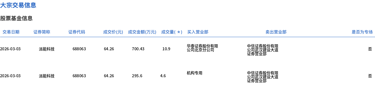 3月3日,派能科技大宗交易成交15.5万股,成交额996.03万元,占当日总成交额的0.59%,成交价64.26元,较市场收盘价69.66元折价7.75%。