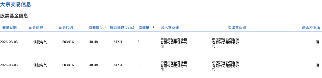 3月3日,信捷电气大宗交易成交10万股,成交额484.8万元,占当日总成交额的2.91%,成交价48.48元,较市场收盘价51.43元折价5.74%。