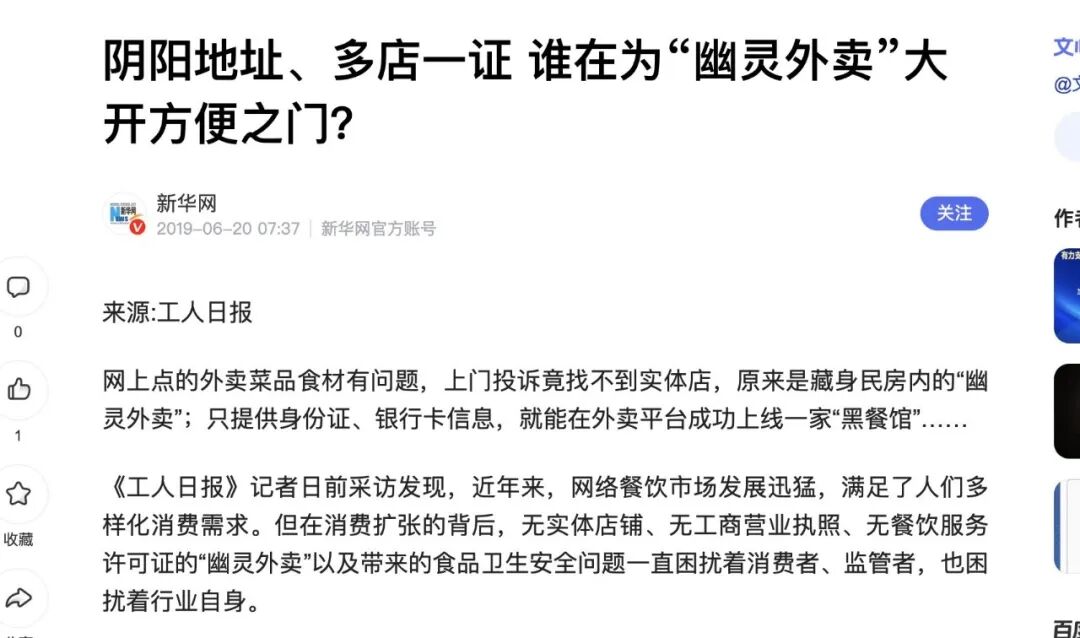 很难有人说清楚,“幽灵外卖”从什么时候开始出现。早在2019年6月,新华网就在一篇《阴阳地址、多店一证 谁在为“幽灵外卖”大开方便之门?》文章中,没有实体店铺、没有工商营业执照、没有餐饮服务许可证的“幽灵外卖”,被大开方便之门。