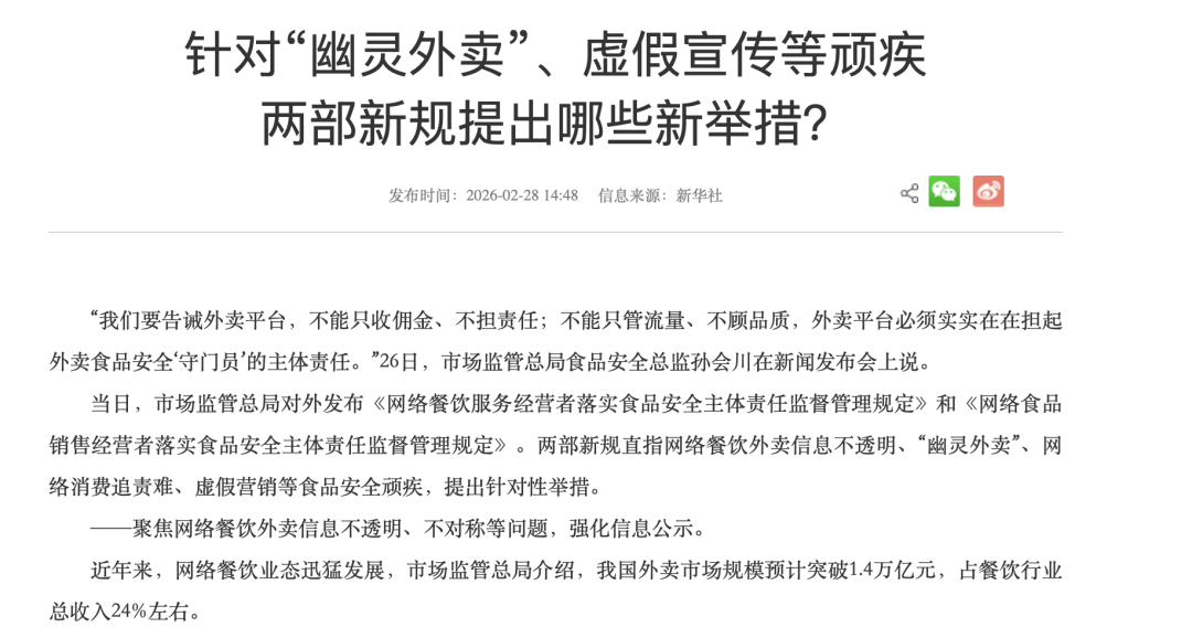 民以食为天,食以安为先。近日,外卖行业迎来重磅新规,市场监管总局祭出重拳,针对“幽灵外卖”发布相关网络餐饮服务经营者食安监管规定,明确提出压实平台主体责任:平台不能只做“收佣金、引流量”的中间商,更应做“守底线、严把关”的守门员,力争从源头封堵监管漏洞。
