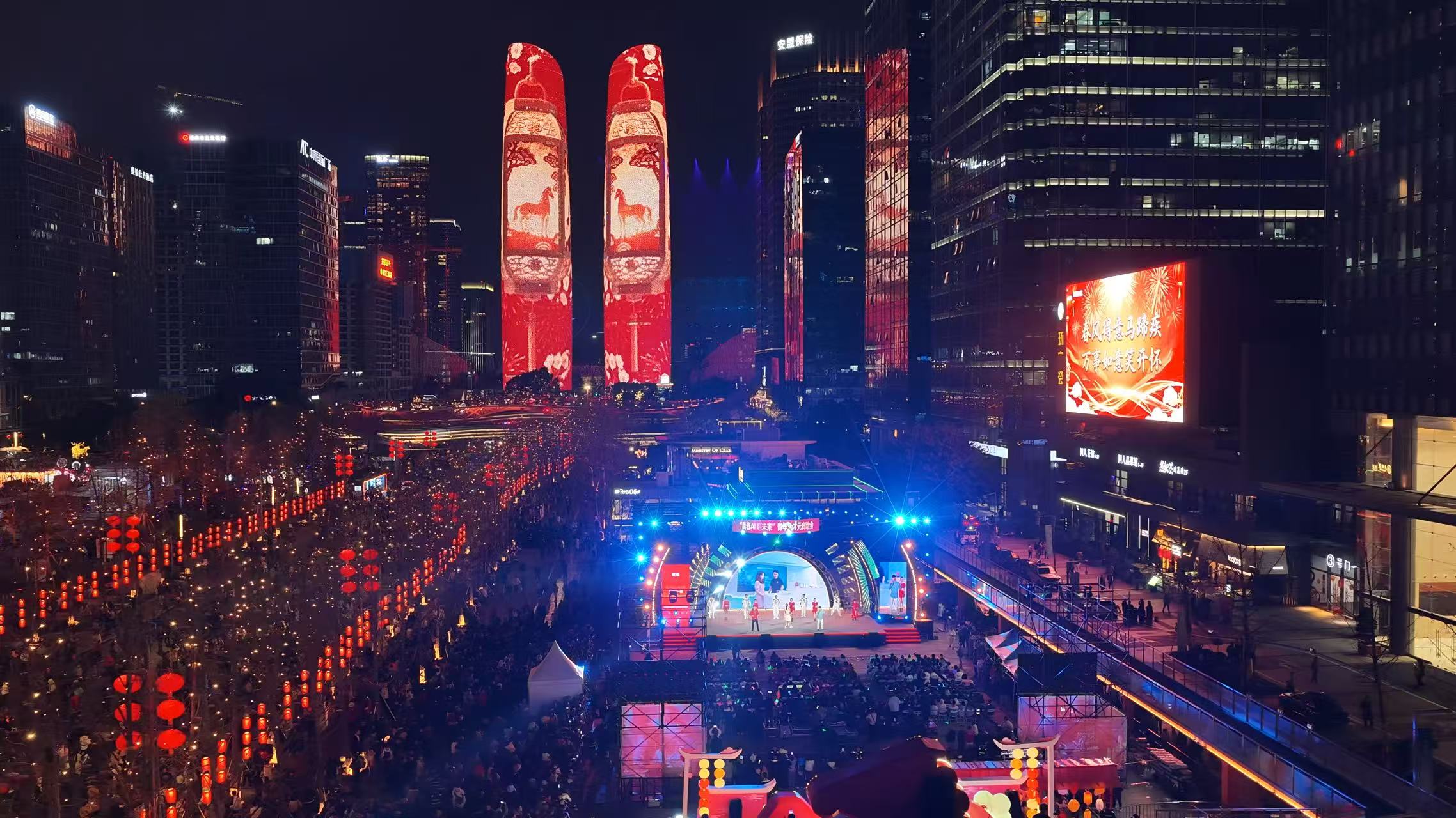 围绕年度子主题,天府双塔特别定制了“跃马入川 奋进当燃”主题视觉,青春群像跃马向前的光影画面,将马年奋进之意与成都高新区的创新之魂深度融合。首度与快手可灵AI联动呈现的“双塔时刻”光影大片惊艳亮相,以蜀绣开卷、锦鲤启幕、火箭升空、万马奔腾等七大篇章,实现成都文脉与高新科技的完美融合,为市民呈现了一场3分钟的视觉盛宴。