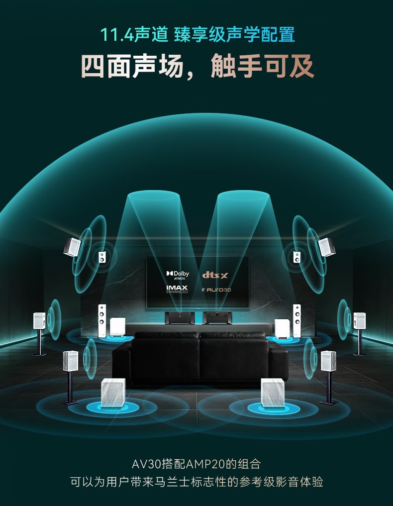 在沉浸式音频体验方面,AV 30 采用 ADI SHARC 双核 DSP 数字处理平台,并搭配 32 位数模转换架构,为多声道高解析音频处理提供充足运算余量。其可完整支持Dolby Atmos杜比全景声与DTS:X三维全景声格式,实现精准的高度声像定位与空间声场重构,并通过 IMAX Enhanced 内容支持,在动态范围、声场规模与细节呈现方面更贴近影院级体验标准。同时,AV 30 亦兼容 AURO-3D 沉浸式三维音频技术,通过高度声道与环绕声道的协同构建更具纵向层次感的声场结构,使不同类型片源均能获得更立体、更具包围感的空间呈现。
