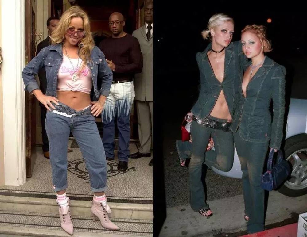 牛仔单品本身并没有什么年代感,是我们从小穿到大并且还要再穿几十年的服装。但是00年代,却很可能是人类历史上牛仔被穿得最尴尬的时期:无法更低的低腰裤加上挂在臀部的皮带,满是贴片或刺绣装饰的喇叭裤,磨白流苏铆钉一股脑上身的ugly jeans,或者从头到脚的牛仔单品——其中最炸裂的时装时刻,无疑是当年小甜甜和贾婷婷这对金童玉女以从通身牛仔造型走上红毯的那个iconic mement了。