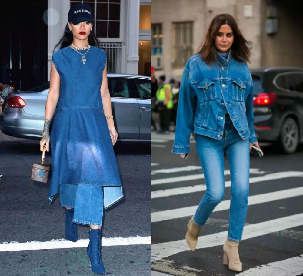 不止这两季的T台上到处是double denim,从高级时装屋到快时尚品牌也都在教我们要这样穿。2017年的博主和明星们也试着把这些“新的旧牛仔”穿上街头,和前辈的区别大约只是在styling上更精简一些。