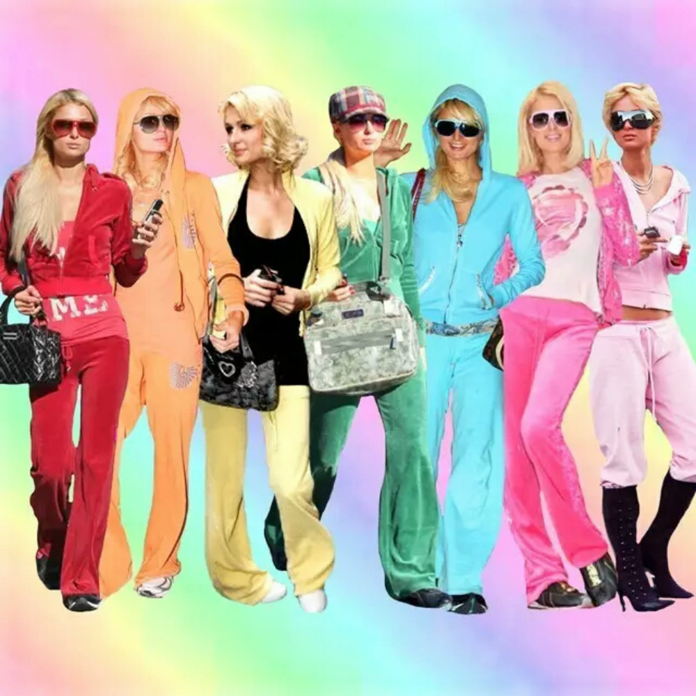 本世纪初的时尚对很多人而言像是一个噩梦般的存在,这个名声很大程度上要归功于当时的“IT item”:Juicy Couture彩色天鹅绒运动套装。无论是比弗利山庄名媛还是好莱坞明星,大家都被下了降头一样穿起了姹紫嫣红的运动套装出街。而这个“降头”的来源绝对少不了热爱粉色公主风的Paris Hilton,毕竟是集齐了彩虹色Juicy Couture的神奇女子: