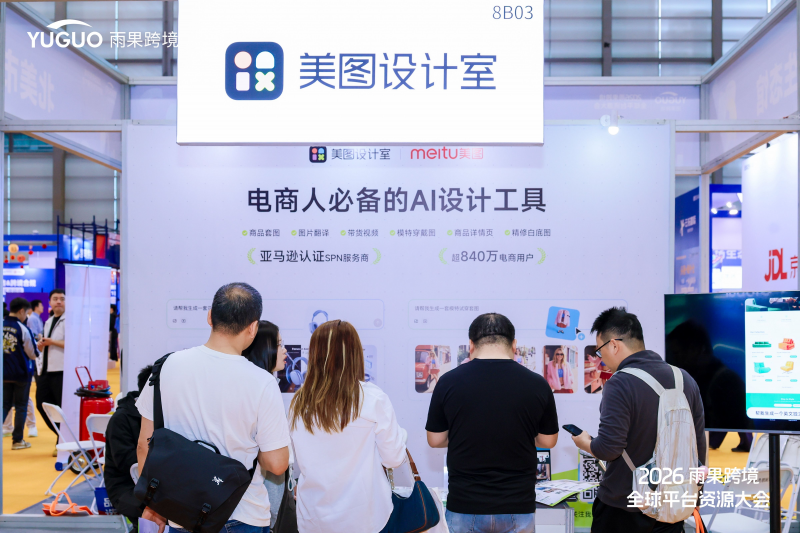 在2026 雨果跨境全球平台资源大会现场,美图设计室展示了最新的AI图像生成与编辑技术,其展位也吸引大量参展者的驻足体验。