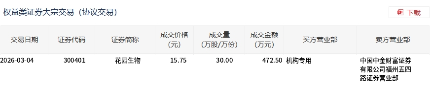 3月4日,花园生物大宗交易成交30万股,成交额472.5万元,占当日总成交额的1.17%,成交价15.75元,较市场收盘价15.75元持平。