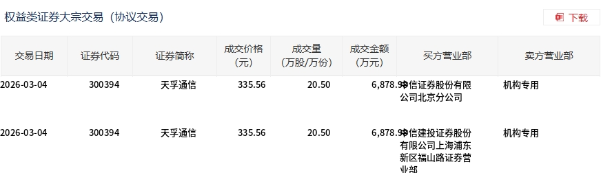 3月4日,天孚通信大宗交易成交41万股,成交额1.38亿元,占当日总成交额的1.41%,成交价335.56元,较市场收盘价335.56元持平。