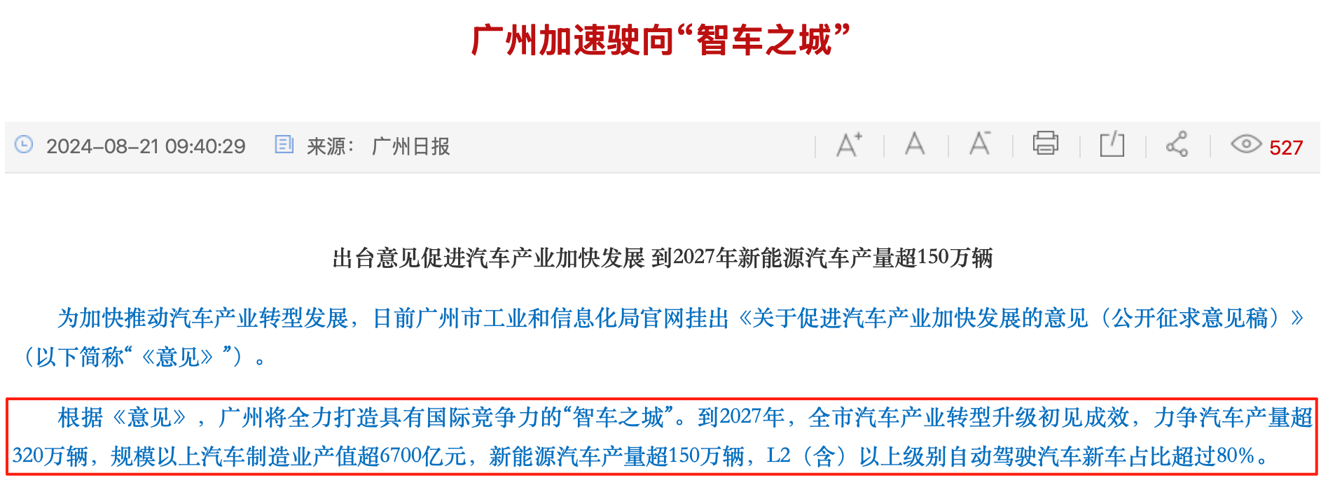 广州也在全力追赶。2025年,广州密集出台政策,目标到2027年实现新能源汽车产量超150万辆,L2级以上自动驾驶汽车新车占比超过80%。小马智行、文远知行等自动驾驶头部企业扎根广州,让这座城市在智能化赛道上拥有先发优势。