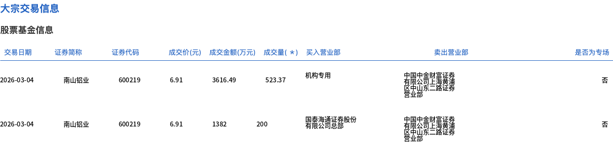 3月4日,南山铝业大宗交易成交723.37万股,成交额4998.49万元,占当日总成交额的1.17%,成交价6.91元,较市场收盘价7.76元折价10.95%。
