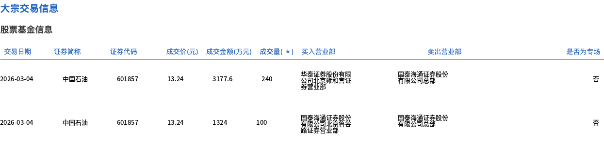 3月4日,中国石油大宗交易成交340万股,成交额4501.6万元,占当日总成交额的0.32%,成交价13.24元,较市场收盘价13.24元持平。