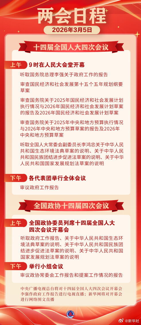 2026两会日程预告|3月5日:十四届全国人大四次会议上午9时开幕