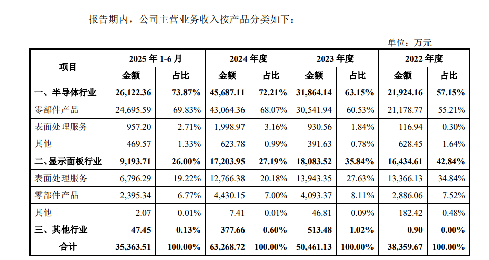 其中,半导体行业的相关业务占比已从2022年的57.15%提升至73.87%,而显示面板业务则逐步有萎缩态势,占比从四成降至两成以上。