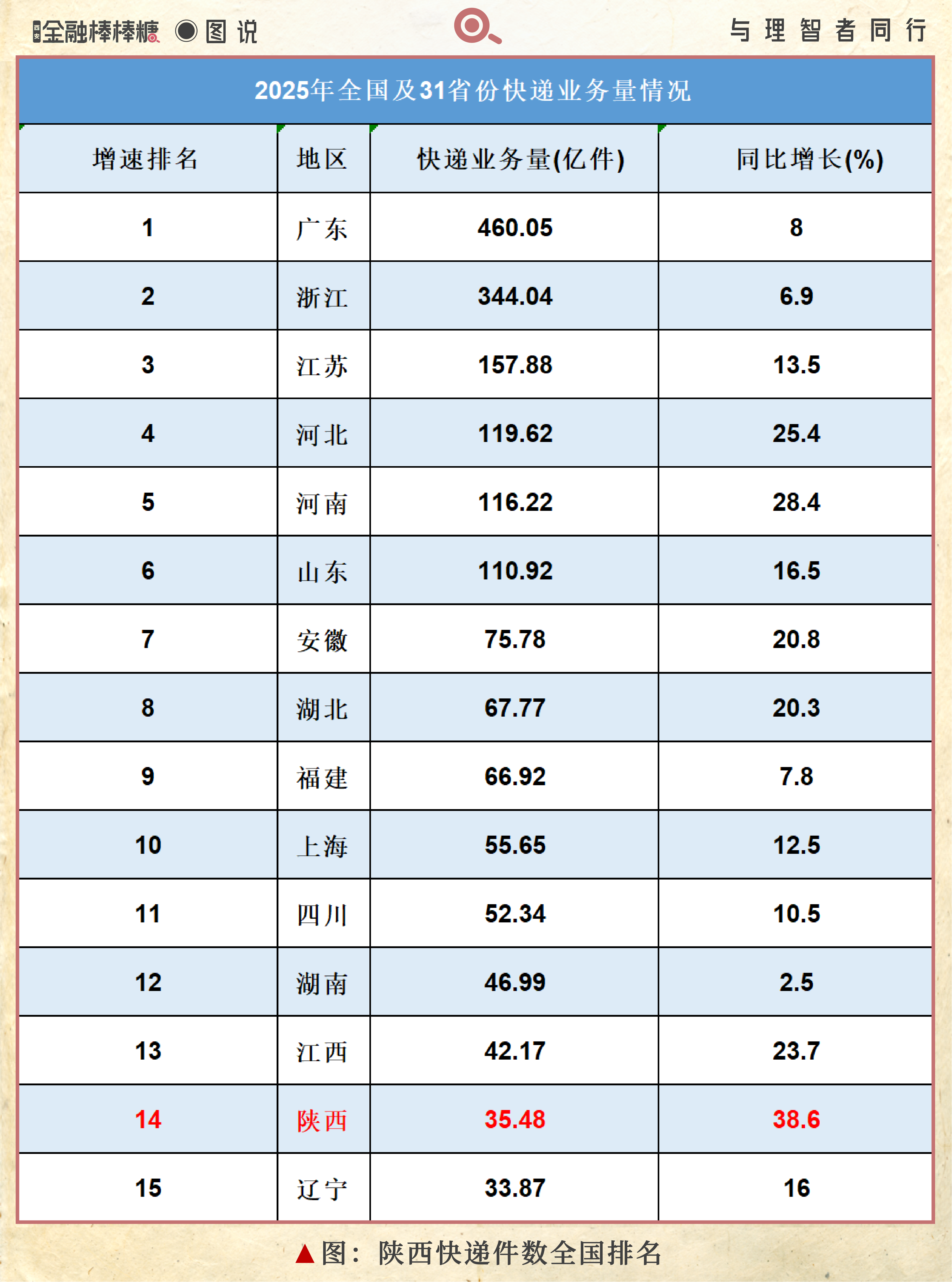 行业信息显示,2025年陕西快递业务量达到35.48亿件,排名从16升至14位;同比增长38.6%,高于行业整体增速25个百分点,同时也成为全国快递业务增速最快的城市。