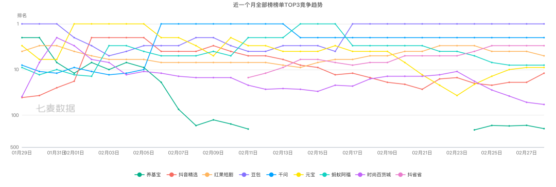 整体来看,有两条比较明显的趋势:一是,排名数据与活动日程确实能一一对应;二是,格局已过争夺震荡期,目前已趋于稳定。该图表曲线来看,前期名次变化较大,近一周(2月21-28日)的排名整体趋于稳定,豆包第一,千问第二。2月28日,前两位没有改变,蚂蚁阿福跌至第八,元宝跌至第九。
