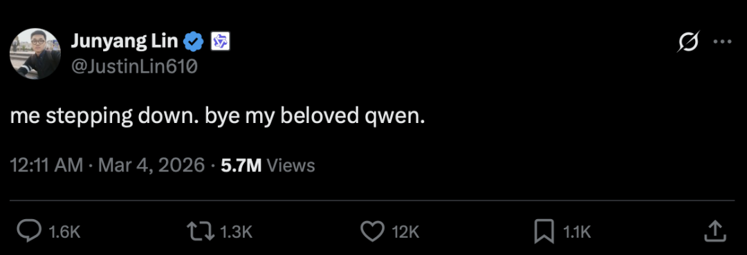 2026年3月4日凌晨,林俊旸在社交平台X(原Twitter)上发布了一条简短的推文:“me stepping down. bye my beloved qwen.”(我卸任了。再见了,我深爱的千问。)
